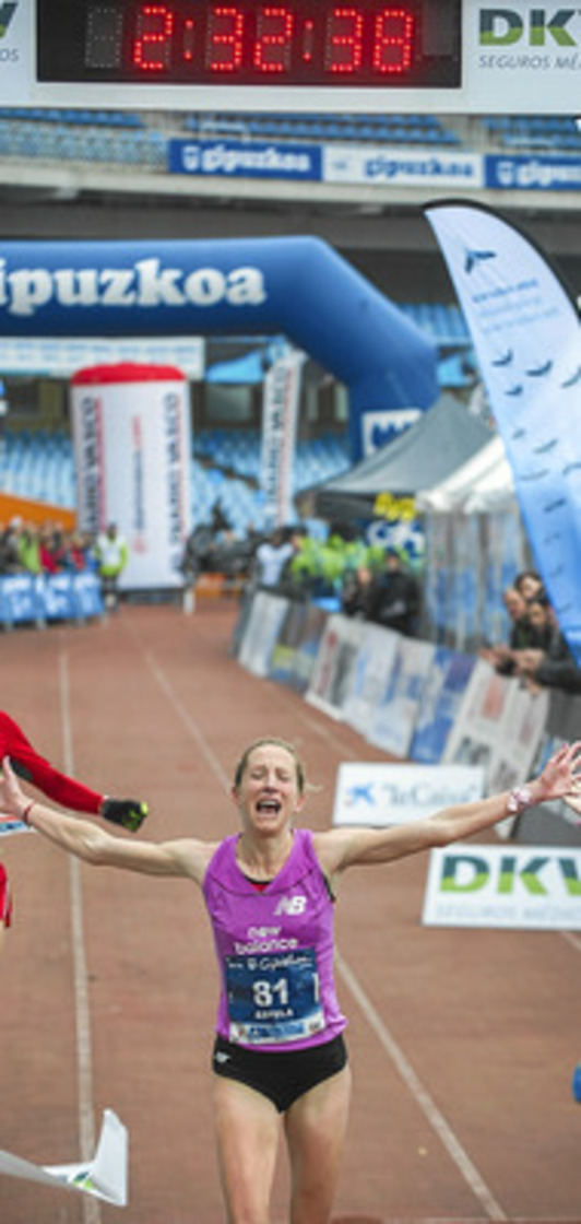 Navascués se impuso con solvencia ante dos veteranas y antiguas ganadoras en la misma meta del estadio de Anoeta, como son la aragonesa María José Pueyo, a la que sacó siete minutos, y la navarra Ana Casares, a la que aventajó en 14 . La iruindarra del Hiru Herri, que alterna el atletismo con el triatlón, se despidió de la distancia desde el podio en su décimo maratón. Claudia Behobide se retiró.