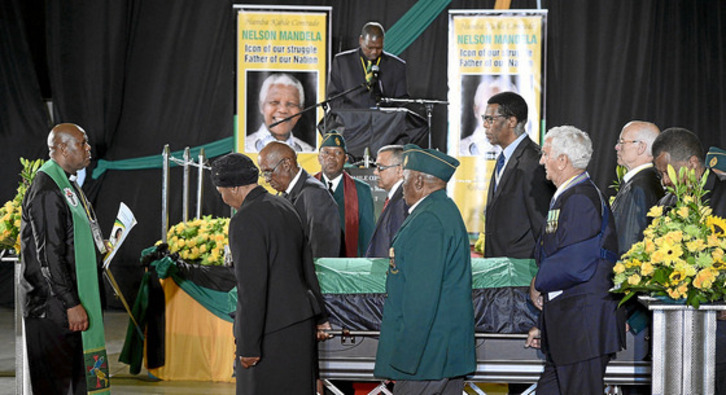 El Congreso Nacional Africano (ANC), con el presidente sudafricano Jacob Zuma, a la cabeza, dio ayer su último adiós al que fuera su líder, Nelson Mandela, antes del traslado de sus restos mortales a Qunu, su localidad natal, en la que será enterrado hoy. El acto tuvo lugar en la base de la Fuerza Aérea de Waterkloof, en Pretoria, y a él asistió alrededor de un millar de integrantes del ANC. El féretro fue envuelto en los colores del partido que lideró el expresidente. Mandela «combinó dos cosas que no son fáciles, la teoría y la práctica y lo hizo muchas veces», resaltó Zuma, que no dudó en calificar al Nobel de la Paz de «hombre de acción». El presidente estuvo flanqueado durante el acto por la viuda de Mandela, Graca Machel y su ex mujer Winnie Madikizela-Mandela. Mandla Mandela, uno de los nietos de Madiba afirmó que «puedo asegurar al ANC que el futuro de este país es brillante». El representante de Sortu y senador Urko Aiartza tomó parte en la guardia de honor ante el féretro de Mandela, junto a Gerry Adams, de Sinn Fein, y representantes del Frelimo, MPLA, Swapo, Frente Polisario y OLP.