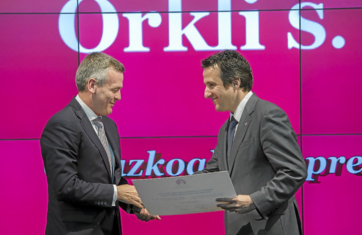 En el acto de entrega de los XXII Premios a la Industria y a la Empresa de Servicios, el presidente de la Cámara de Comercio, Pedro Esnaola, entregó el de Empresa de Gipuzkoa a Patxi López Urkiola, director gerente de Orkli, cooperativa industrial fundada en 1982 y dedicada al diseño, producción y comerciali- zación de componentes para instalaciones de calefacción, agua caliente sanitaria y sistemas de calentamiento de agua.