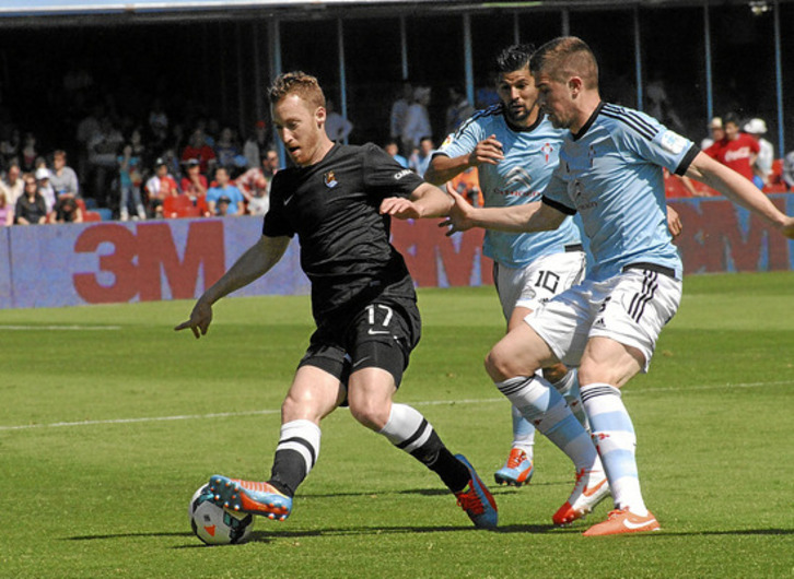 Con el empate acabó el dominio del Celta y llegó la reacción de la Real, que primero tuvo un remate de Vela y después consiguió volverse a poner por delante en una jugada en la que Agirretxe ganó bien un balón aéreo y Griezmann rompió su sequía goleadora con su pierna mala.