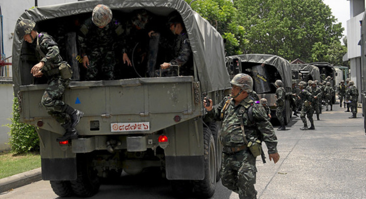 La Constitución tailandesa permite al Ejército declarar la ley marcial, que otorga a los militares el control de la seguridad sobre todo el territorio. Algunos analistas creen que su utilización es «una forma cuidadosamente pensada de mantenerse en la legalidad colocando a Tailandia bajo control militar» y otros aseguran que el Ejército «no irá más allá».
