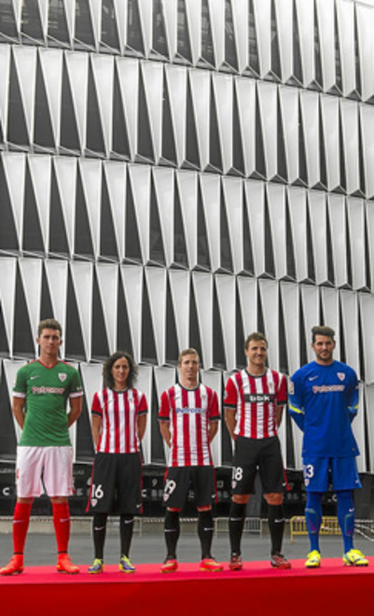 La ropa, confeccionada por segundo año consecutivo por la marca Nike, fue presentada ayer en San Mamés con Iker Muniain, Carlos Gurpegui, Aymeric Laporte, Iago Herrerín y la jugadora del equipo femenino Amaia Olabarrieta como modelos en la sesión fotográfica. La principal novedad en la primera equipación serán unas franjas verticales rojas y blancas en la camiseta más estrechas que en la anterior, y además lleva una pequeña etiqueta con la ikurriña. La segunda equipación, por su parte, cambia del azul de la pasada temporada al verde, similar a la que utilizó el Athletic entre otros partidos en la final de la Europa League. GARA