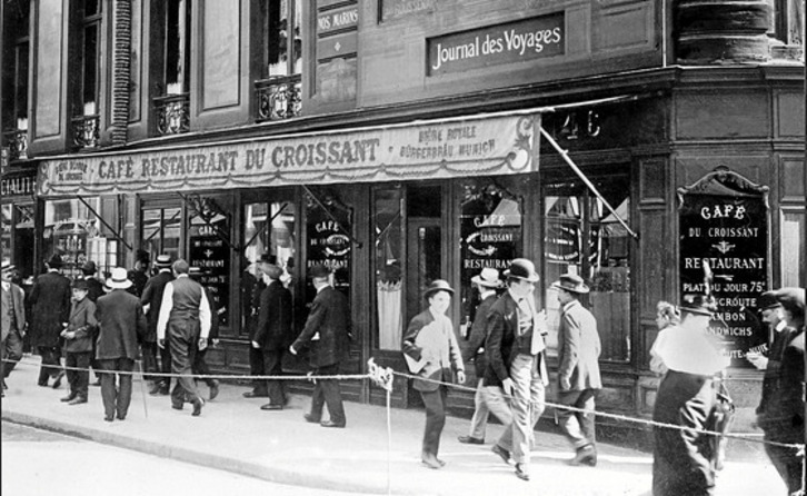 A pesar de que han transcurrido cien años, la fachada del “Café du croissant” que aparece en la fotografía que acompaña estas líneas es fácilmente reconocible para quienes pasean hoy día por el centro de París. Y es muy fácil toparse con este establecimiento porque se encuentra en una de las esquinas de la rue Montmartre y el rótulo principal no ha variado mucho: ahora se lee “La Taverne du Croissant”.