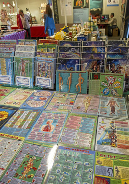 Mientras Rodríguez avanzaba con su taller, Miramar iba llenándose de gente que curioseaba en los puestos repartidos por las salas del palacio donostiarra. Algunos vendían productos de lo más variopinto: talismanes, barajas de tarot, incienso natural, musicoterapia, cristales de sanación, atrapasueños, láminas de reflexología de manos, pies, cara... Los barceloneses «Esoterismo Nostradamus», por ejemplo, tenían más de 500 barajas de tarot diferentes. «Para aprender suelo aconsejar los básicos, como el Tarot de Marsella, y luego según van aprendiendo eligen su propia baraja. Por intuición o identificación, por lo que uno siente. Es como con el coche: cuando vas a sacarte el carné no te importa el coche, pero cuando tienes experiencia y quieres comprarte uno nuevo, entran en juego otros factores», explicó la dependienta.