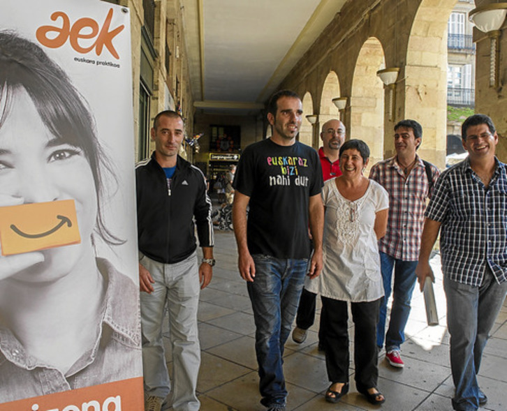 Mertxe Mugika AEKren koordinatzaile nagusiak Asier Amondo, Helios del Santo, Oskar Elizburu, Iñaki Urkijo eta Bizente Claverie Artezkaritza Kontseiluko kideak izan zituen ondoan, atzo Bilbon egin zen kanpainaren aurkezpenean. Mugikak berak azaldu zuenez, «benetako protagonistak» AEK-k eskaintzen dituen ikastaro eta barnetegietan aritu diren milaka ikasleak dira. Horregatik, AEKn euskara ikasten aritu diren lau ikasleri bizitakoa konta dezatela eskatu diete kanpainan; bideoak web orrian daude ikusgai informazio guztiarekin, euskaraz, gazteleraz eta frantsesez.