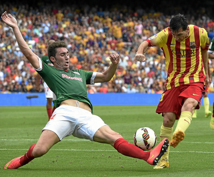 No se arredró el Athletic ante lo obvio y planteó el encuentro como acostumbra, mirando a su rival a los ojos. Intentó presionar arriba, buscando el error, o al menos las dudas de los catalanes. Pero pocas veces, casi nunca, le salió bien. El Barcelona apenas mostró fisuras, no perdió el balón, se lo ató al pie -llegó al descanso con un 66% de posesión- y además fue muy capaz de mantenerlo en todo momento en las inmediaciones del área de Gorka Iraizoz. El guardameta hizo un gran partido, con media docena de intervenciones de mucho mérito, pero no pudo evitar lo que pronto pareció una cuestión de tiempo. Porque, por mucho lugar que haya que dejar a la sorpresa, el empate no tardó en parecer el mejor resultado al que podía aspirar un Athletic con escasísima presencia en ataque. Y, con el Barcelona asomándose al área por oleadas, tampoco se presentaba una tarea sencilla. Era cuestión de tiempo que se agotasen las fuerzas o, también como consecuencia de ello, apareciese el primer error, que rara vez desaprovechan los futbolistas blaugranas.