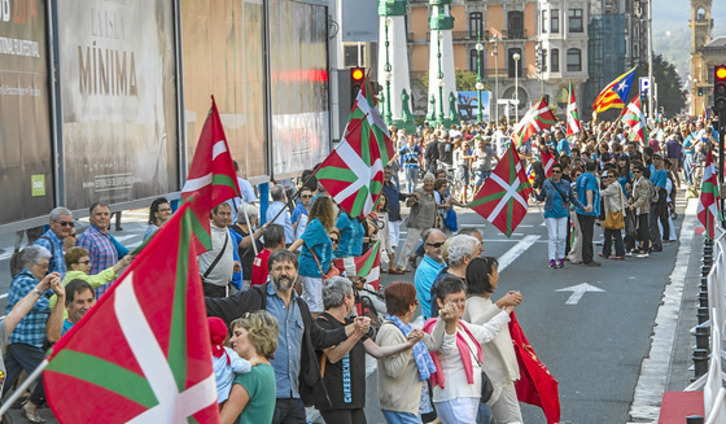 Las inmediaciones del palacio del Kursaal, situadas en el foco mediático internacional debido a la celebración de Zinemaldia, acogieron ayer una multitudinaria y colorida réplica de la gran cadena humana que tuvo lugar desde Durango a Iruñea el 8 de junio. Entre los promotores de la iniciativa se hallaban personas muy conocidas por su relación con el mundo del cine como Itziar Ituño (actriz), Klara Badiola (actriz), Ane Gabarain (actriz), Eneko Olasagasti (guionista y director), Juanba Berasategi (productor y director), Iñaki Gomez (productor) y Ramon Agirre (actor).