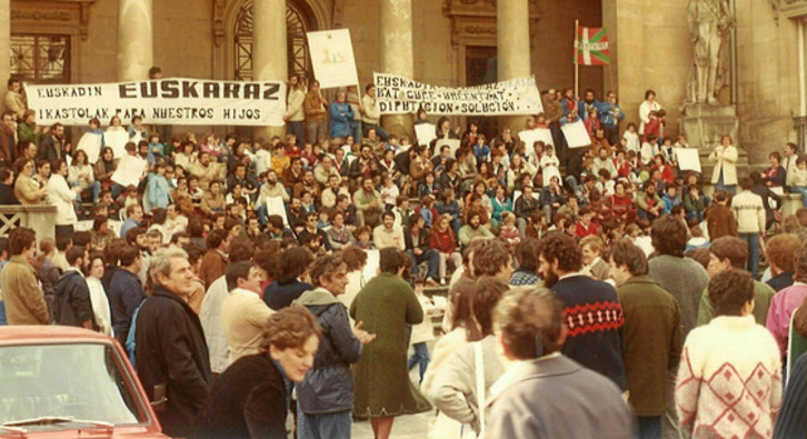 Pese a que han pasado 35 años, todavía recuerda cómo fueron los inicios en diez aulas habilitadas en un garaje de la calle Sancho El Sabio y en la Iglesia de Los Ángeles. «Éramos niños y no entendíamos muy bien lo que pasaba. Íbamos con nuestros padres a concentrarnos frente al Palacio Foral, donde se ponía una fila de miñones. Sabíamos que las movilizaciones tenían que ver con el euskara, pero no entendíamos el contexto al que tuvieron que hacer frente», subraya tras explicar algunas de las protestas que tuvieron lugar durante los primeros años de la década de los ochenta.