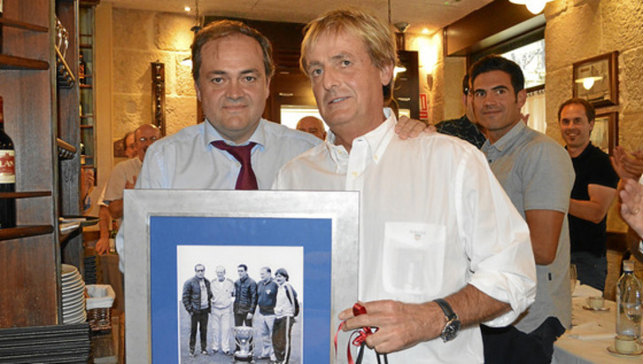 Iñaki Anza, fisioterapeuta de la Real durante 42 años que se jubiló en verano, fue homenajeado ayer por directivos, jugadores y técnicos aprovechando la comida que compartieron en la Parte Vieja. «Estoy orgulloso de pertenecer a esta familia», reconoció emocionado.