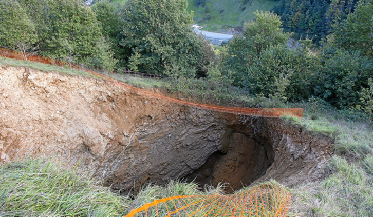Un impresionante agujero de varios metros de diámetro y sesenta de profundidad se ha ido abriendo sobre el túnel Anoeta del tramo Hernialde-Zizurkil, obligando a la paralización de la obra. El Departamento de Medio Ambiente y Política Territorial afirma que el problema en la obra «está actualmente solucionado». Pero fuentes a pie de tajo aseguran que los trabajos de excavación no se han reiniciado.