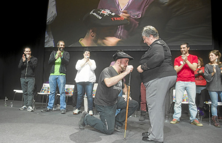 Estilo propioa eta oso markatua dauka denerako. Baita txapela janzteko ere. Belauniko itxaron zion Kristina Mardarasi oholtza gainean, pozik, airean kasik. Fredi Paiak arima utzi zuen atzo oholtzan, eta bueltan txapela eraman zuen etxera. 901 puntu balio zituen txapela.