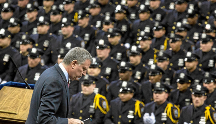 El sindicato Patrolman's Benevolent Association (PBA) no se lo ha perdonado. Primero, a través de una nota en la que se afirmaba que «las manos del alcalde están literalmente empapadas de nuestra sangre debido a sus palabras, sus acciones y sus políticas, y ahora nos hemos convertido, por primera vez en muchos años, en un departamento de Policía en `tiempos de guerra'». Y posteriormente, por boca de Patrick Lynch, presidente de la mencionada asociación, que si bien rechazó la nota, mantuvo el tono de sus acusaciones con continuas referencias a las «manos manchadas de sangre».