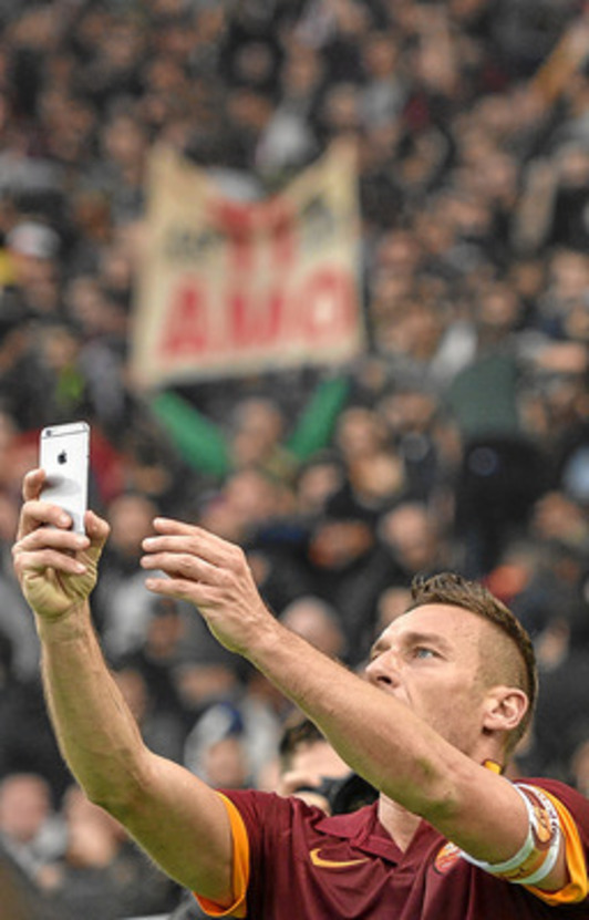 Este domingo se vivió un nuevo derbi capitalino en la Serie A, la stracittadina, con el Olímpico como escenario de la enésima batalla, vibrante, emocionante, con alternativas. La Lazio se puso por delante con un 0-2 al final del primer tiempo. A vuelta de vestuarios, emergió la figura solemne, venerada, ilustre del gran capitán. ¡Oh, capitán, mi capitán! Francesco Totti primero acortó distancias y después ejecutó un gol acrobático que a sus 38 años para sí quisieran muchos veinteañeros con bisagras menos roñosas que él. Empate, éxtasis giallorosso y el hijo de la Loba que se dirige al preparador de porteros de su equipo, le toma prestado el teléfono móvil, acude a la histórica Curva Sud del Olímpico, tataranieta de los Guerriglieri della Curva Sud de los años sesenta, y se hace un selfie con la grada de fondo, que da la vuelta al mundo.