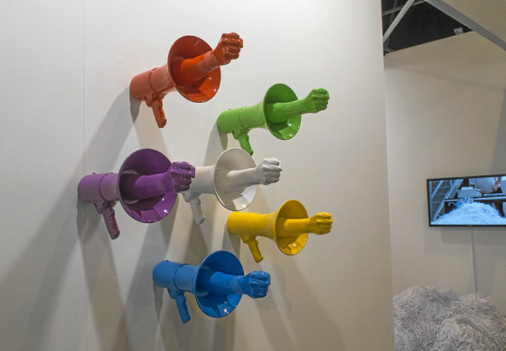 También la galería barcelonesa ADN (como viene siendo habitual) abrió su stand a este tipo de propuestas, destacando los murales de Carlos Aires y la reinterpretación de Eugenio Merino de la simbología del 15-M. Si el año pasado este autor trabajó sobre las máscaras de «Anonymous», en esta edición presentó una serie de coloristas megáfonos de cuyo interior emerge la rabia y la contundencia de un puñetazo.