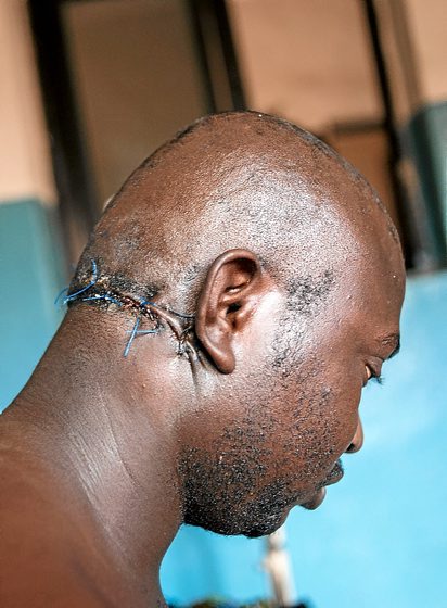 «Nire anaiari tiro egin zioten eta ondoren nire aita labana batekin zauritu zuten», dio Nsukka hiriko erietxean, soina erakusten duela. «Ni zauritzeko, berriz, aihotza erabili zutelakoan nago. Hilda nengoela pentsatuko zuten», erantsi du, buruan duen hogei zentimetroko ebakiondoa erakutsiz. Bizitza osorako orbaina.