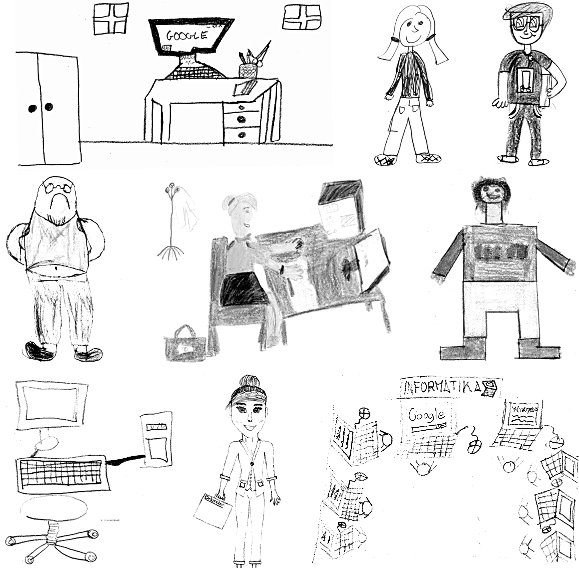 Informatikari bat eta haren lan-ingurunea marrazteko eskatu diegunean, aldiz, alde nabarmenak agertu dira neskato eta mutilen artean. Neskek joera handixeagoa dute informatikariak taldean marrazteko mutilek baino (%24tik %17ra jaisten da), baina joera nagusia bakarka irudikatzea da. Betaurrekoen erabilera, ordea, berdin baloratzen dute batzuek zein besteek; irudien %42etan ageri gara betaurrekoekin. Informatikariaren generoa aztertzen badugu, erantzun guztien arabera, %30ek emakumea marrazten dute, %52k gizonezkoa, eta %17an zaila da bereiztea. Azterketa haurren generoaren arabera bereizten badugu, emaitzak oso desberdinak dira. Mutilen kasuan, emakumezko, gizonezko eta definitu gabekoen portzentajeak %10, %68 eta %21 dira hurrenez hurren, eta neskatoen kasuan, aldiz, %50, %36 eta %13. Inkestaren arabera, beraz, 10-12 urteko neskatoen erdiek eta mutil batzuek informatikariak emakume irudikatzen dituzte.
