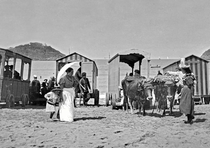1840an, I. Karlistaldia bukatutakoan, Donostiako Kontxako hondartzan lehenbiziko aldagelak agertu ziren, bainulariak itsasertzeraino eramateko idiak baliatzen zituztenak. Donostiako lehen bainu-arautegia 1829koa da, eta bi gune ezarri zituen, bat gizonezkoentzat eta beste bat emakumezkoentzat, hala nola ordutegi ezberdinak, batzuk eta besteak batera ez bainatzeko. Bi urte geroago, kaian eta Santa Katalina zubian bainatzea debekatu zuen udal bandoa atera zuten, donostiar gazteak biluzik bainatzen baitziren leku horietan. Argazkia Juan Rafael Aldayk egin zuen XIX. mendearen amaieran. 1911n, udal arkitektoa zela, Kontxako bainuetxe berria, hegala eta bainularientzako aldagela berriak proiektatu zituen.