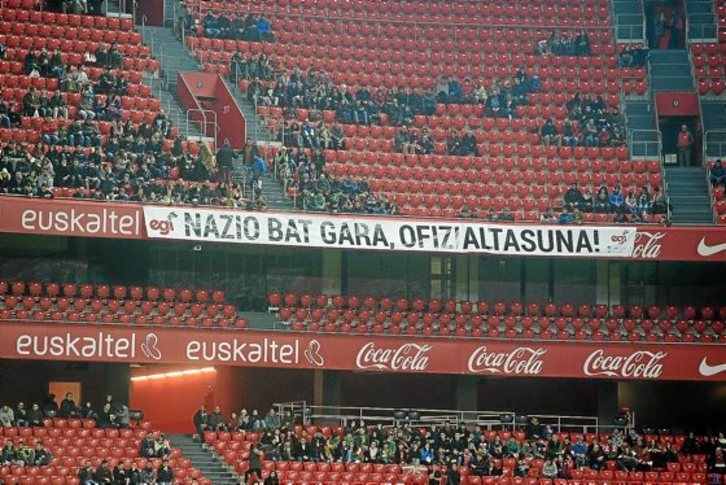 ESAITen agurrarekin, 2015ean Jauziak eginiko pankarta atera zuten San Mameseko zelaira, “One nation, one team” lelopean. Euskal Selekzioaren azken neurketan, ordea, giro ilunaren seinale gisa ez zen pankartarik zelairatu. «Egungo egoeraren isla da», gehitu du Toledok.