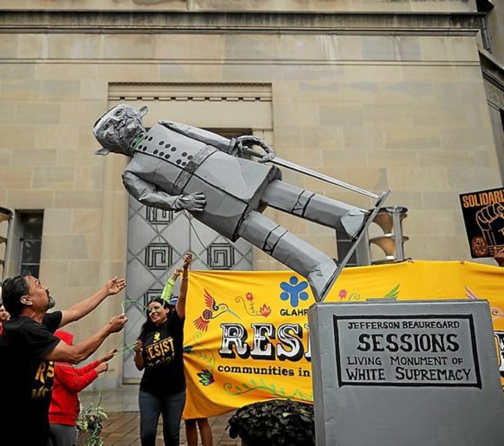 Sinbolo horiek nahikoa iraun dutela pentsatu zuten askok eta Virginian oldartu dira haien kontra Ku Klux Klaneko kideak, alt-right mugimenduko militanteak, nazionalismo zuriaren bozeramaileak. Hain nabarmenki dira salagarriak, eskuetan zeramatzaten suziriak egin zituen enpresak berak ere gaitzetsi egin dituela. Presidenteak, ostera, haien artean «jende ona» ere badagoela esan du, eta, besteak beste, Black Lives Matter mugimenduak esandakoa agerian geratu da berriz: arrazaren zauria itxi gabe dago eta normala da, tarteka, odola borborka isurtzea.