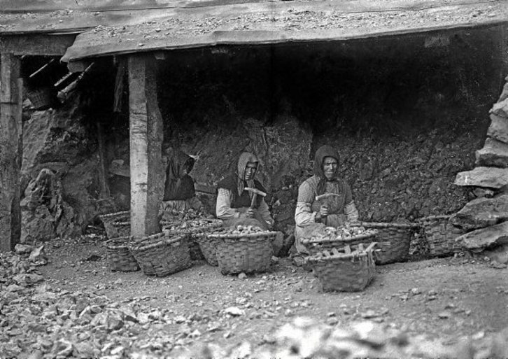 Meatzaritzan emakumeak egindako lana oso garrantzitsua izan da. Etxeko lanaz eta zaintzaz aparte, maiz bestelako enpleguak ere bilatu beharra izaten zuen emakumeak familiaren bizi baldintzak hobetzeko: besteen etxeak garbitzea, meatzeetan mineralak garbitzea, baztertutako mineralak miatzea, mineral saskiak garraiatzea... Lan gogorrak egokitzen zitzaizkien askotan emakumeei, eta, gainera, jasotzen zituzten soldatak gizonek jasotzen zituztenen azpitik izaten ziren beti. Egile ezezaguneko argazki hau 1900. urte ingurukoa da eta Pobeñako zamatzeko tokian dago eginda, Muskizen (Bizkaia). Irudiak ondo jasotzen du emakumeek egin behar izaten zituzten lanen gogortasuna. Irudian emakumeak pikotxarekin minerala txikitzen ikusten dira, El Pobaleko burdinolara eraman baino lehen. Argazkia Macc Lennanen funtsekoa da. Jatorri eskoziarreko enpresaria zen Macc Lennan, Bizkaian hainbat meatzeren gidaritza izan zuena. Gaur egun argazki funts hori Muskizko Udalean dago.