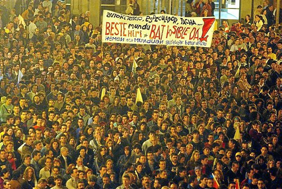 [...] testuinguru horren erdian, tragoa eskuan hartuta elkarri oporretako gorabeherak kontatzen ari zirela, bat-batean… poliziaren eskutik inoiz bizi izan dudan erasorik bortitzena. [...] nire hormaren kanpoaldean, “Utzi bakean Gaztetxea” zioen kartel handia eskegi zidan gaztetxeroetako batek.