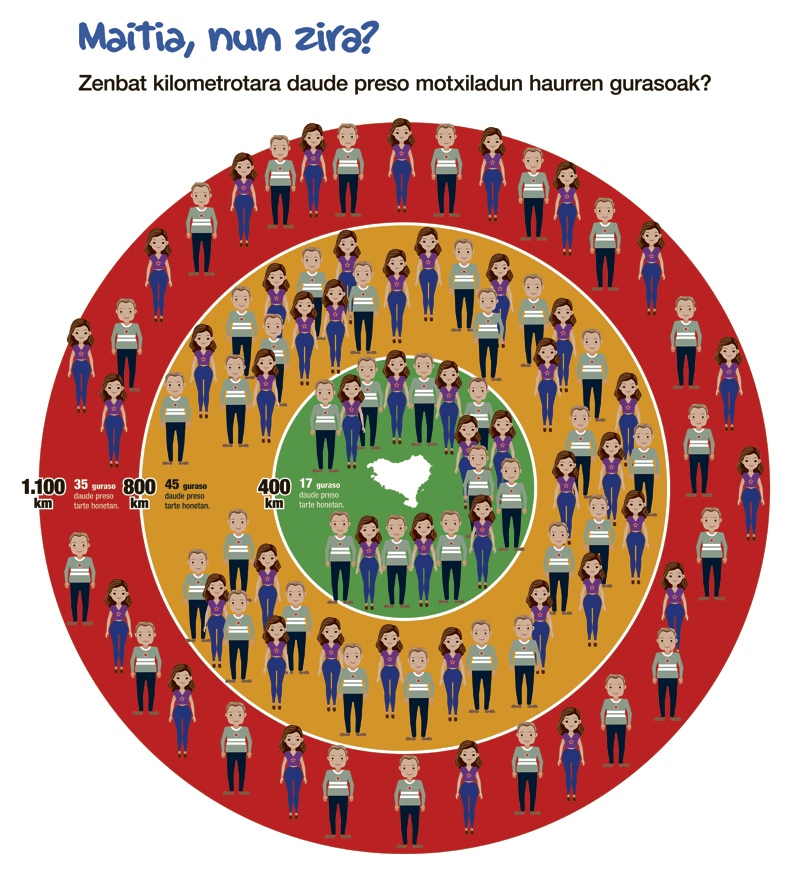 Gurasoak ikusi ahal izateko haurrek asteburuero egin behar dituzten kilometroak ere jaso ditu erakusketak modu oso grafikoan. Gehienek, bidaiatu behar duten 100 umeotatik 45 haurrek, 800 kilometro arteko joan-etorriak egin behar dituzte gurasoekin egon ahal izateko. Haur motxiladunen kolektiboko 17 haurrek 400 kilometroko bidaia egin behar dute gurasoengana joateko. Egoera latzena, baina, 35 haurrek sufritzen dute: asteburuero 1.100 kilometro egin behar izaten dituzte beren gurasoekin egoteko.