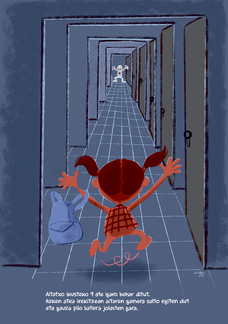 Aitaren bizitokia ezagutzen ez duen bezala, aitak ere ez du alabaren logela ezagutzen. Ez ditu eskolan egin eta paretan jarritako marrazkiak ikusi, ezta Olentzerok ekarritako jostailuak ezagutu ere. Aitak ez du inoiz bere logelara eraman.