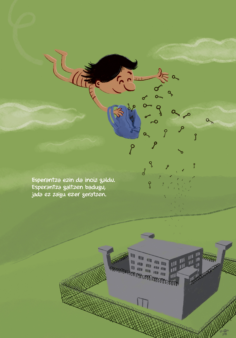 Gurasoren bat espetxean duten haurren errealitatea bistaratzeko asmoa dute orriotan jasotako hamabi artelanek. Exprai artistaren sinadura dute, eta kartzelarekin harreman estuegia duten haurren eta nerabeen hitzak eta sentipenak dira grafikoki ikus daitezkeenak. «Motxila etorkizunez bete» erakusketa Sare Herritarrak sustatu du.