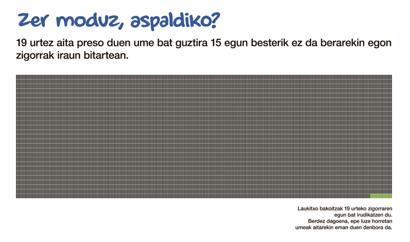 19 urtez guraso bat preso duen ume bat 15 egun besterik ez da berekin egon zigorrak iraun bitartean. 19 urte horietan partekatu ahal izan dituzten bisiten ordu kopurua, gutxi gorabehera, 360 ordukoa izango baita.