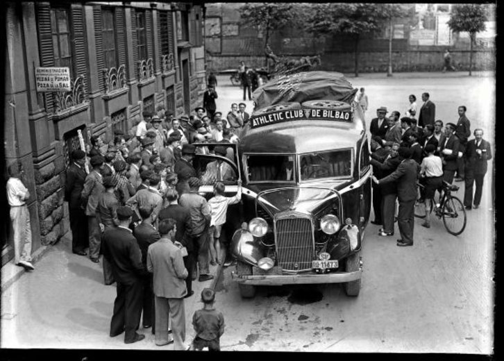 Gaur egun ezagutzen dugun liga txapelketa 1928/1929 denboraldian sortu zen. Hurrengo bi denboraldietan Bilboko Athletic txapeldun izan zen eta, halaber, lau kopa ere irabazi zituen jarraian 1930 eta 1933 artean. Hasieran jokalari zuri-gorriek desplazamenduak trenez egiten zituzten. Urte batzuk igarota, baina, autobusa erabiltzen hasi ziren, artikulua ilustratzen duen irudian ikusten denez. 30eko hamarkadakoa da argazkia, eta jokalariak eramaten zituen autobusa klubaren egoitza zaharraren aurrean ageri da. Autobusa Txori Gorria izenarekin ezaguna izan zen urte askoan. German Elorza (1910-1983) Gasteizen jaio eta Bilbora bizitzera joan zen argazkilaria da irudiaren egilea. Kazetari grafiko gisa lan egin zuen beti, “La tarde” egunkariarentzat lehenik, eta, 1937an Bilbo erori ostean, frankistek sortutako “Hierro” egunkariarentzat.