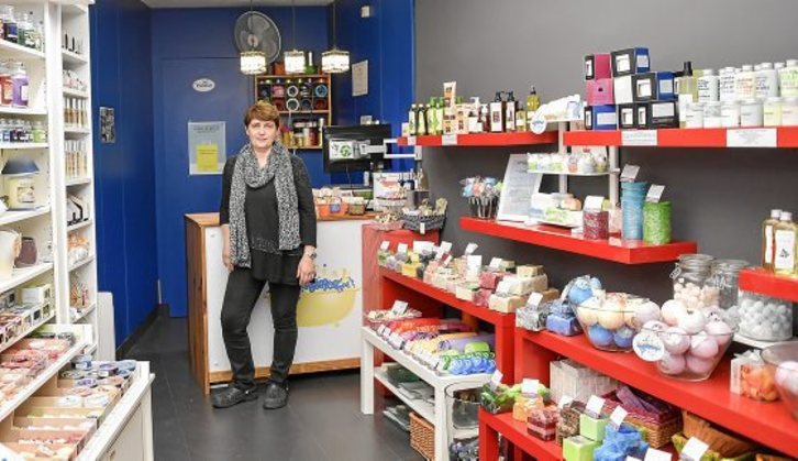 Emakume batek mukiak kendu ditu Iruñeko Mercaderes kaleko Xaboiak dendara sartu baino lehen. «Marranta baduzu ez da dendara etortzeko egunik egokiena», ohartarazi dio Reyes Gutierrezek. Duela zortzi urte hartu zuen xaboi naturalak saltzen dituen dendaren ardura, eta, bertan, usaimena da gidaririk hoberena.