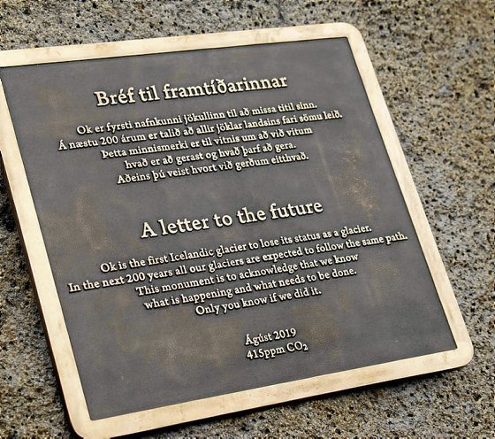 Andri Snaer Magnason idazle islandiarrak egindako idatzia ekitaldiko datarekin eta airean dugun karbono dioxido kontzentrazioarekin amaitzen da. «Bestelako denbora esparru bat etortzen zaizu burura paperean idatzi beharrean kobrearen gainean idazten duzunean –esan dio Magnasonek BBCri–. Imajinatzen hasten zara hemendik 300 urtera norbait etorriko dela plaka hori irakurtzera».