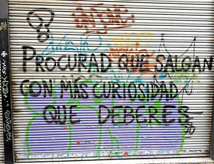 Hezigunetik atera eta etxerako bidean, lagunak gure herriko kaleetako batean topatu duen horma izkiriatuaren argazkia bidali dit. Argazkia zabaldu dudanean “Procurad que salgan con más curiosidad que deberes” irakurri dut. Gari eta Ibai etorri zaizkit burura, haien jakin-mina. Eta nire buruari galdetu diot zer-nolako lekua ote duen jakin-minak heziguneetan, txostenetatik at, noski. Zenbat hartzen ote dugun kontuan, zenbat arduratzen ote gaituen, zenbat zaintzen ote dugun gure jardunean! Norbaitek proposamen iradokitzaile bat utzi digu horman idatzirik: «Saiatu etxerako lanekin baino jakin-min handiagorekin irten daitezen».