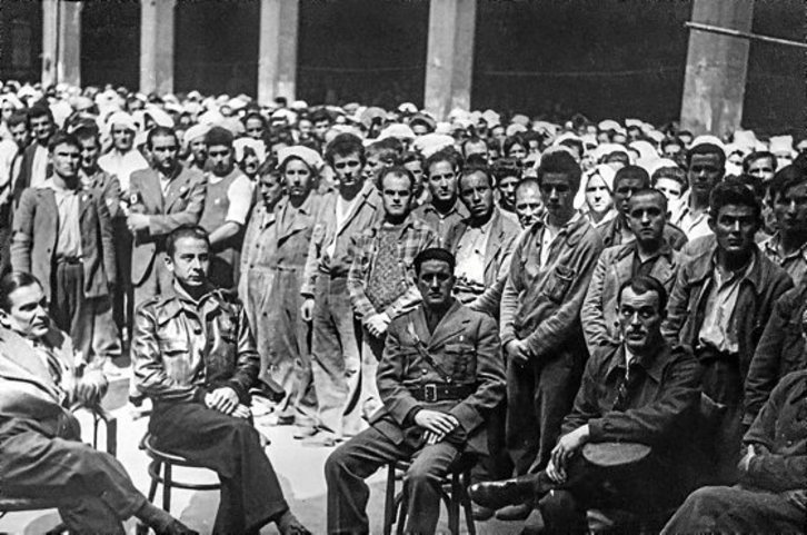 1937ko ekainaren 19ko arratsaldean armada frankista Bilbon sartu zen. Alemania naziaren eta Mussoliniren Italiaren laguntzaz dozenaka euskal herri bonbardatuta ehunka zibil hil izana ez zuten nahikoa, nonbait. Hasi zen errepresioak erbestera eraman zituen bizkaitar asko, beste askok beren lana galdu zuten, haietako milaka kartzelatu egin zituzten eta ia 600 Larrinagako kartzelan eta Derioko hilerriko hormetan erail. Gehienak fusilatuta, baina haietako 34 garrotez. Artikulua ilustratzen duten bi irudiak autore ezezagunekoak dira, baina laztura eta errepresio frankista bikain islatzen dituzte. Bilboko Eskolapioetan zegoen kartzelan eginak dira. Milaka euskal herritar egon ziren bertan pilatuta. Goiko argazkian apaiz bat ageri da kartzelako patioan presoei hitz egiten. Behekoan, presoak argazkian ateratzeko prest, aurrean beren kartzelariak dituztela.