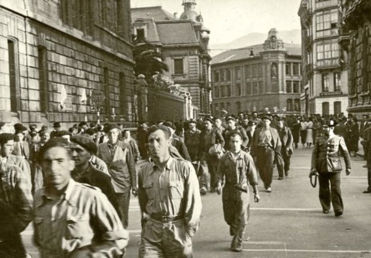 1937ko martxoaren amaieran, Bizkaiaren kontrola bereganatzeko erasoaldi bat egin zuen armada frankistak, Alemaniako Kondor Legioak eta Italiako Aviazione Legionariak lagunduta. Bereizi gabeko bonbardaketak izan ziren, batez ere biztanleria zibilaren aurka, ehunka hildako eragin zituztenak. Urte horretako ekainaren 19an frankistak Bilbon sartu ziren. Bi egun lehenago, milaka bonba jaurti zituzten Bizkaiko hiriburuan. Matxinatuak sartu ondoren, besteak beste Otxandio, Itxasalde, Martiartu, Irrintzi, Malato, Itxarkundia, Saseta eta Araba batailoietako milizianoek amore eman zuten. Ekainaren 22an, 2.000 euskal miliziano baino gehiago preso zeuden Arriaga antzokian, eta handik, kamioietan, Gasteizera eraman zituzten, Logroñoko zezen plazara bidean. Testua ilustratzen duen argazkia 1937ko ekainaren 22an egindakoa da, Astarloa kalean. Eskuinaldean Bizkaiko Aldundiaren eraikina dago. Argazkian ageri diren miliziano presoak Guardia Zibilaren zaintzapean eramaten ari ziren. Uneko drama ezkutaezina islatzen du irudiak. Begitarte gogorra etorkizun zalantzagarriaren aurrean. Haietako askorentzat, kartzela, langile batailoiak, kontzentrazio esparruak edo heriotza. Argazkiaren atzealdean Estatuaren Prentsa eta Propaganda Ordezkaritzaren zigilua dago, eta haren egilea Andres Perez Cubero galiziarra izan zen, gerra amaitu ondoren hainbat dokumentaletan argazki zuzendari gisa lan egin zuena.