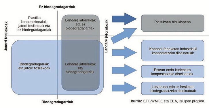 Alta, arretaz begiratuz gero, ikusiko dugu material berri hauetako asko jada ez direla erabilera bakarrekoak; «berrerabilgarriak» edo «iraunkorrak» direla irakurri ahalko dugu hauen labeletan. Halako izendapena, orain arte, modu mugagabean garbitu ahal ziren materialei ematen zitzaien elikaduraren esparruan, baina orain bost-hamar aldiz garbitu ahal direnak ere horrela izendatzen dira. Boteprontoan, beraz, material hobeak egiten ari gara, baina kontsumo tasak apenas jaitsi gabe. Hori bai, material berri hauetako asko landare jatorrikoak, bio-degradagarriak edo konpostagarriak dira orain, eta kontzientzia lasaiagoarekin bota ditzakegu zakarretara soilik behin erabili arren. Jakina, zein zakarretara bota behar diren jakinez gero! Irudira ekarri dut eskematxo bat, latak seinaka eramateko sei zuloko plastiko haietan arrainak bezala trabatu ez gaitezen. Konpostagarriak diren plastiko gehienak soilik prozesu industrialen bidez degradatu ahal dira, eta landare jatorrikoak izateak ere ez du bermatzen material hauek erraz degradatzea.