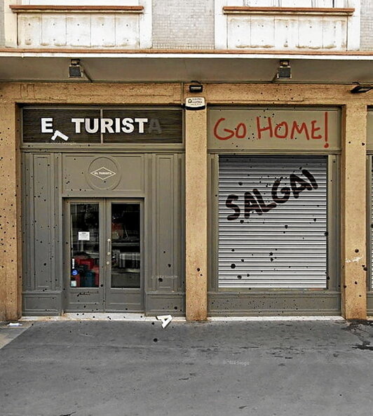 “Tourist go home” leloa aspalditik dabil bolo-bolo hiri askotako paretak atontzen, baina duela gutxira arte, erreibindikazio politiko marjinala izan da leku gehienetan. Turismoa, oro har, begi onez ikusten zen. Are gehiago, poza ere ematen zuen gure hirietan bisitariak ikusteak. Harrotasun puntu batekin genioen: hara, bagara zerbait, badator jendea gugana! Hasierako abegikortasun hura, baina, urte gutxian mesfidantza bihurtu da, turistak traba dira orain. Bertokoenak ziren txokoak konkistatu dituztelako, gure ohiturak aldatzera eraman gaituztelako, gure etxea izan zitekeenaren prezioa hirukoiztu dutelako…
