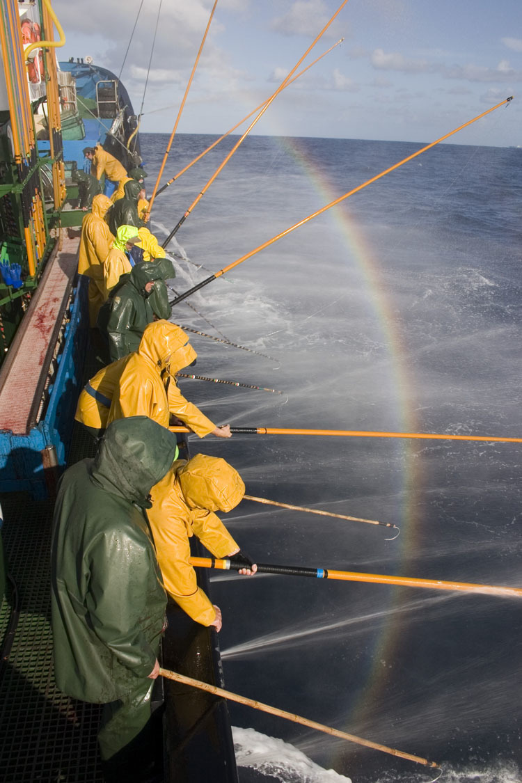 Ortzi-mugara so zelatan zegoen marinelak eman du abisua. Kostata, baina azkenean atun traska edo sarda bertan da. Ez dago denbora galtzerik. Ordura arteko kresal usainari adrenalinarena batu zaio bat-batean. Aginduaren zain, arrantzaleak euren postuetan dira eta orduan, burua leihatilatik atera eta ‘bota, bota!’ oihukatu du patroiak. Seinalea da, arrantza hasi da. Peiteroak salabardoa atxiki eta uretara antxoa biziak (beita bizia) botatzen ditu; kaineroek amuak eskuetan hartu eta beita jartzeari ekin diote; bien bitartean, karelean diren tutuek ur zurrusta etengabeak jaurtitzen dituzte barkua bits artean ezkutatzeko ahaleginean...