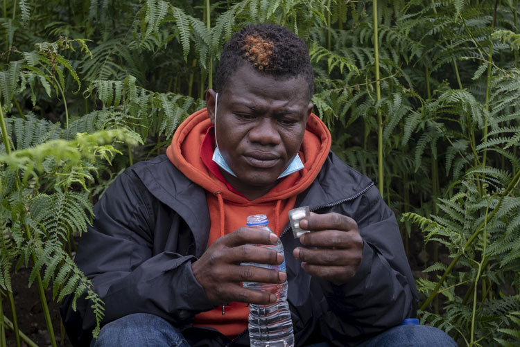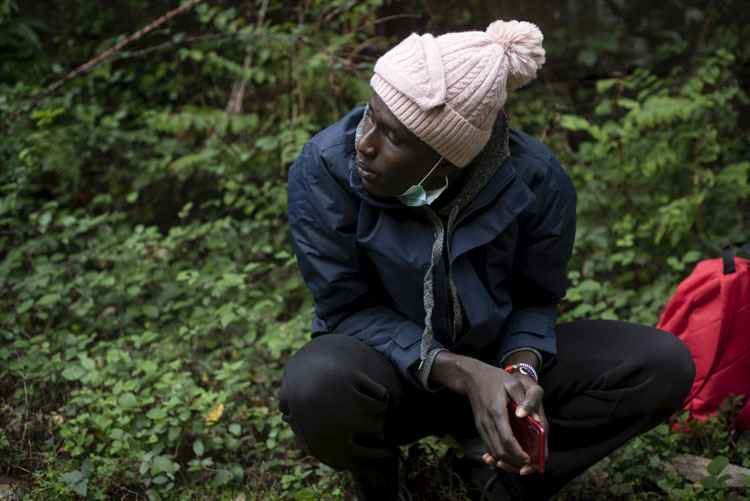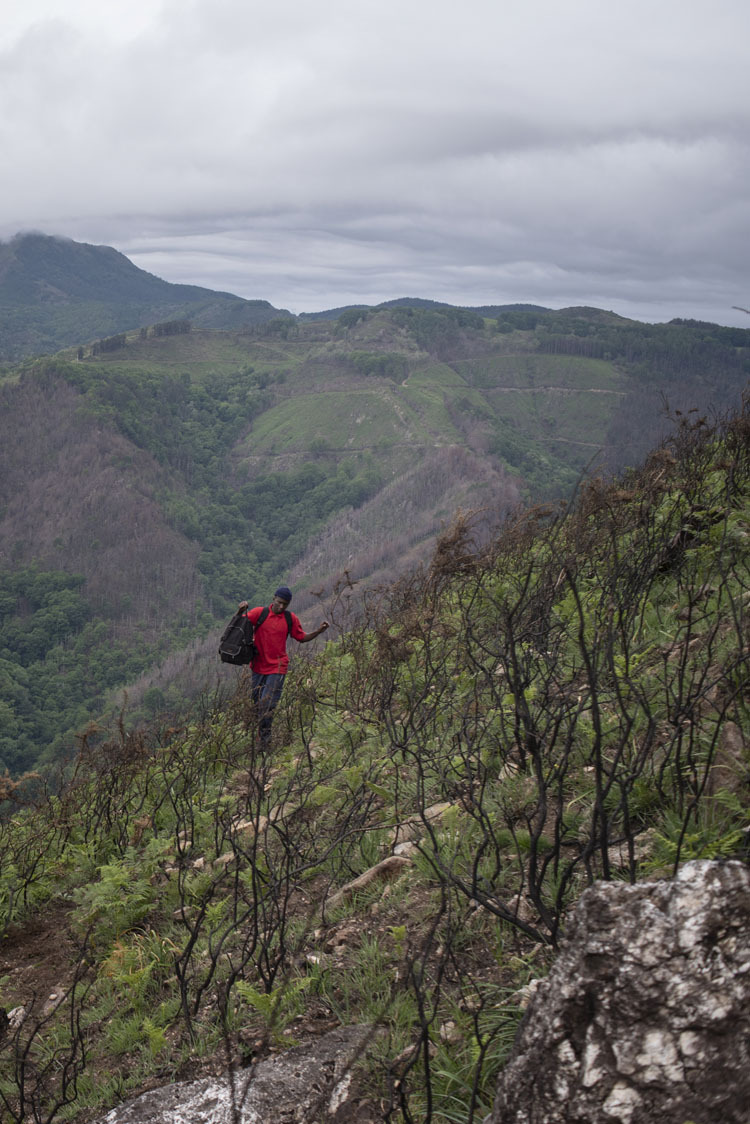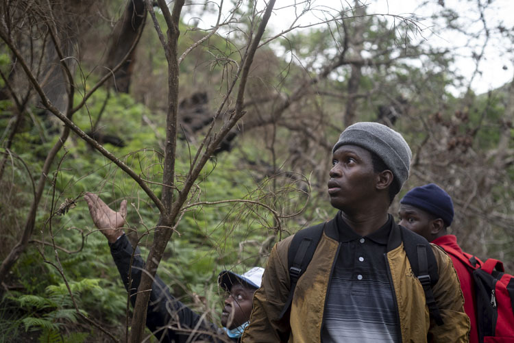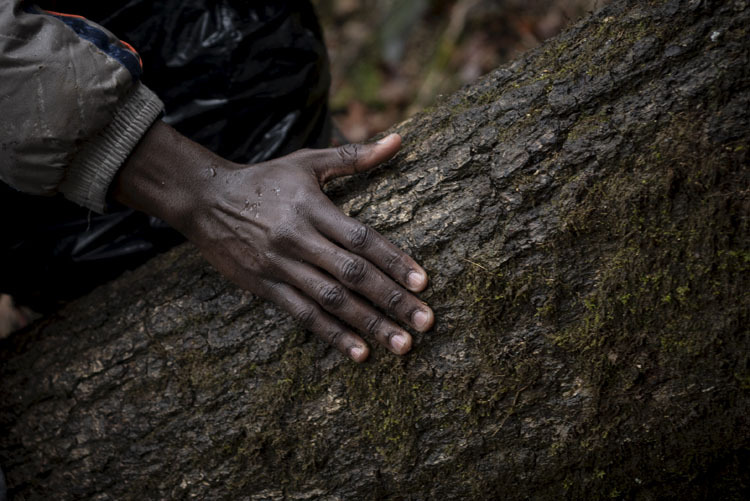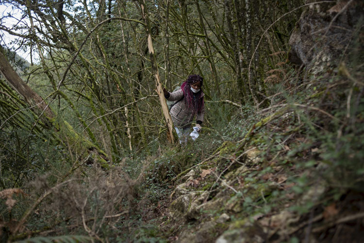 Duela hilabete batzuk su hartu zuen paraje honek, eta iratze berria dago non-nahi, fresko, eta estalki berde bizi horren gainean kiskalitako zuhaitzak ikusten dira, hostorik gabeko adar beltzak eta lurrera jausitako enbor hilak. Ia metro bete duen iratzeak zaildu egiten du ibiltzea; gerriraino ailegatzen zaie eta ezin dute ikusi oina non jartzen duten, ez da erraza bidea. Aldapan gora doaz, poliki, norantz doazen argi izan gabe. Ibrahimak fresko dirudi, ez zaio neke keinurik sumatzen. 18 urte dituen mutil argal luzea da, taldeko gazteena. Oinetako gorri-gorriak dauzka jantzita eta kolore bereko polo mauka-motza; txano urdin ilun bat du burua estaltzeko. Metro batzuk atzerago ditu Aden eta Abdoulaye, izerditan biak, baina martxa onean. Oumar da besteen pausoari jarraitzeko zailtasun handienak dituena eta atzean geratzen hasia da jada; arnasestuka doa, ezin aurrera egin.