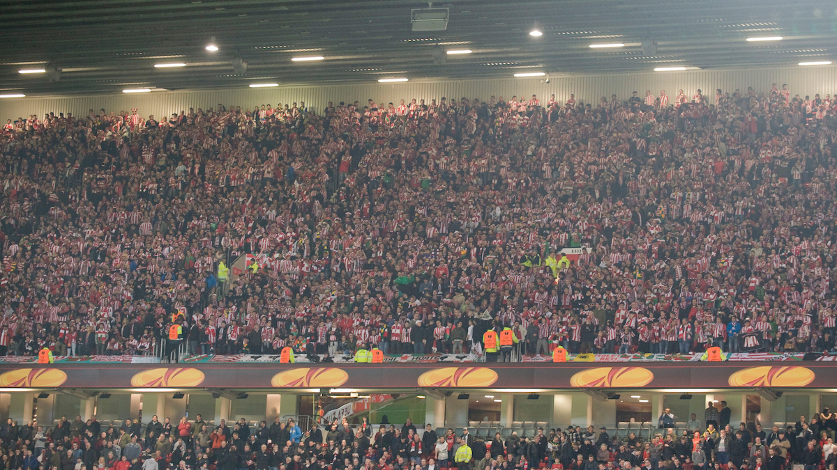 Unos 8.000 hinchas viajaron a Inglaterra para presenciar el partido en directo, en lo que sigue siendo uno de los mayores desplazamientos de aficionados en las competiciones europeas para ver un encuentro que no fuese una final. Uno de ellos fue el algortarra Iker Garagarza, que entonces contaba con 27 años, y que recuerda que fue «una experiencia muy chula, mi segundo viaje europeo con el Athletic, antes estuve en Bremen en 2009». Aquella cita desbordó todas las expectativas: «Nos comimos un montón de horas, cinco o seis tranquilamente, en el antiguo San Mamés para conseguir una entrada, mientras se estaba construyendo en el nuevo campo justo al lado. Cuatro colegas volamos a Londres, alquilamos un coche y fuimos a Manchester. Llegamos la víspera y el día del partido recuerdo la fiesta, estar en bares muy curiosos colindantes a la catedral. Me encontré con mucha gente del pueblo, que no sabía ni que había ido, estuvo muy bien».