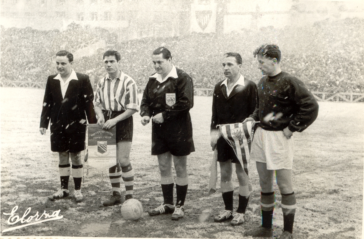 El emparejamiento entre vascos y mancunianos contaba con unas reminiscencias históricas evidentes para el cuadro rojiblanco. Y es que 55 años antes, el Athletic había disputado una legendaria eliminatoria contra el Manchester United de Sir Matt Busby en los cuartos de final de la Copa de Europa. El triunfo cosechado por el elenco de Fernando Daucik por cinco a tres en San Mamés bajo una intensa nevada permanecía en el recuerdo de los hinchas más veteranos, que además había transmitido a sus hijos e hijas la importancia de aquella victoria. Fue el 16 de enero de 1957, a las 15:30 de la tarde, bajo una copiosa nevada que añadió todavía más épica al encuentro. Uribe por partida doble, Markaida, Merodio y Artetxe marcaron los tantos del Athletic, mientras que Taylor, Viollet y Whelan fueron los autores de los goles ingleses. El último de ellos, a apenas cinco minutos del final del partido, lo que dejaba las espadas en todo lo alto para la vuelta. Según las crónicas de la época, Matt Busby, manager del ManUnited señaló que los leones «habían prácticado un fútbol excelente», mientras que el eslovaco Daucik remarcaba que su equipo lo había hecho «fenomenalmente». Al día siguiente, los titulares de la prensa hablaban de un Athletic «grande» en el diario falangista Hierro, de que «la categoría del Manchester United da las máximas dimensiones al triunfo rojiblanco» en El Correo, de un «triunfo merecido y justo» en Mundo Deportivo o de un «wonderful match and wonderful team» como señaló Francisco Arriquibar en La Gaceta del Norte. El periodista de L’Equipe, Gabriel Hannot, inspirador de la copa europea de clubes, también asistió en directo a un encuentro legendario.