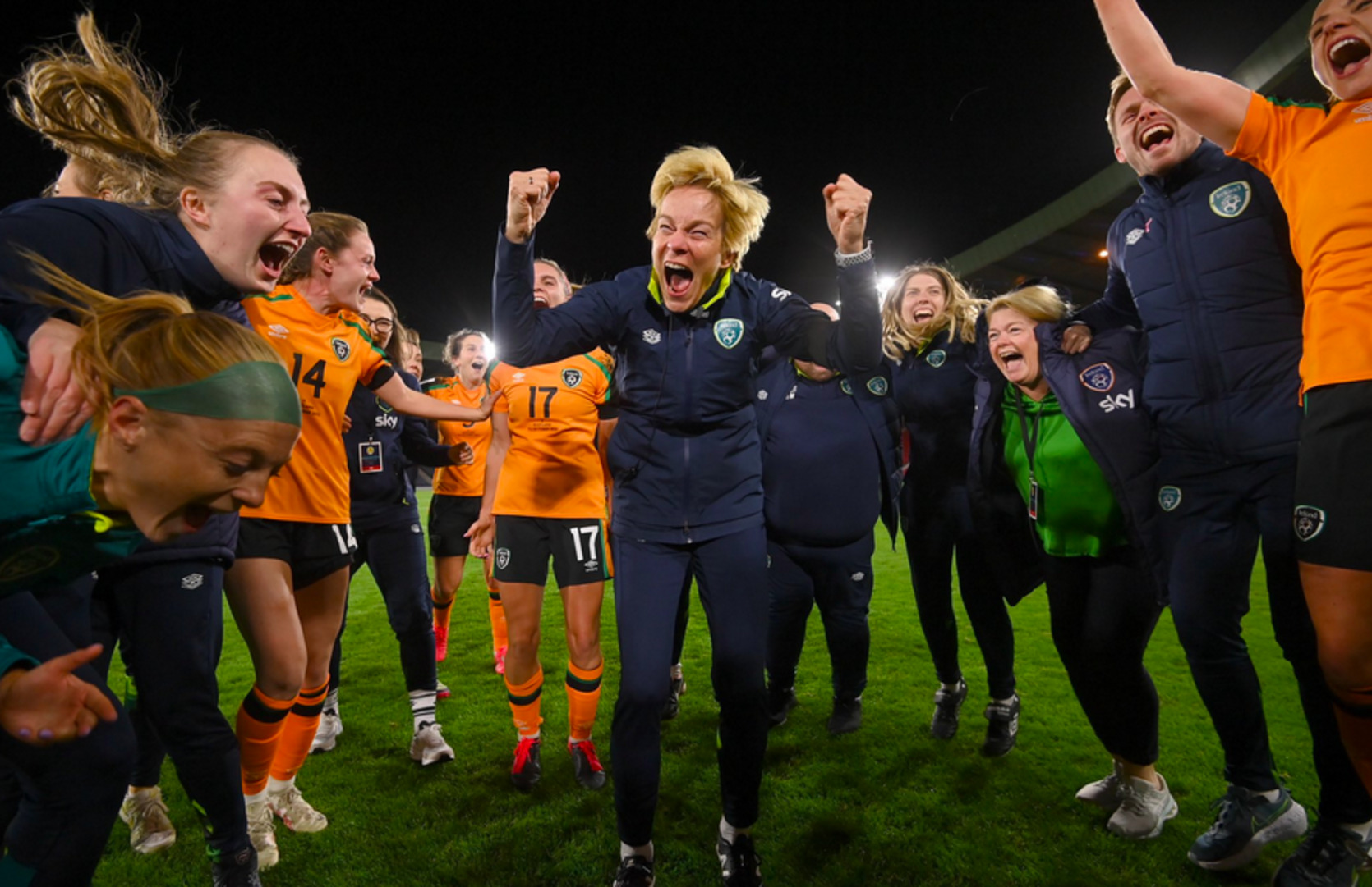 La seleccionadora Vera Pauw celebra la clasificación para el Mundial con las jugadoras.