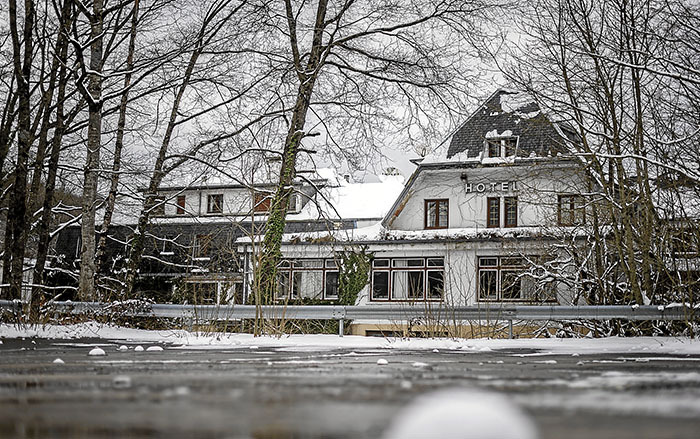 Garaiko dotoreziaren arrastoak dira elkarrekin ikusi ditugunak. Estilo nordikoz eraikitako pareta zuridun eta arbelezko teilatudun eraikinak itxura dekadentea du orain. Distira duen bakarra segurtasun enpresaren logoa daukan plaka da. Elurrak estaltzen dituen arren, sastrakak hazi dira etxearen inguruan. Zurituta dagoen porlanezko aparkalekua zeharkatu eta jatetxearen sarrerara joan gara. Belarra, goroldioa eta pare bat irristadatxo. Leiho zabal bat dugu parez pare; kanpoko erlaitzera igo gara eta bertatik ikusi dugu jantokia.