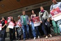 Patxi Zabaleta, Rebeka Ubera eta Dani Maeztu Aralarreko zuzendaritzako kideek agerraldia egin dute gaur, datorren irailaren 26rako sindikatuek eta gizarte eragileek Hego Euskal Herrian deitutako greba orokorrari babesa emateko.