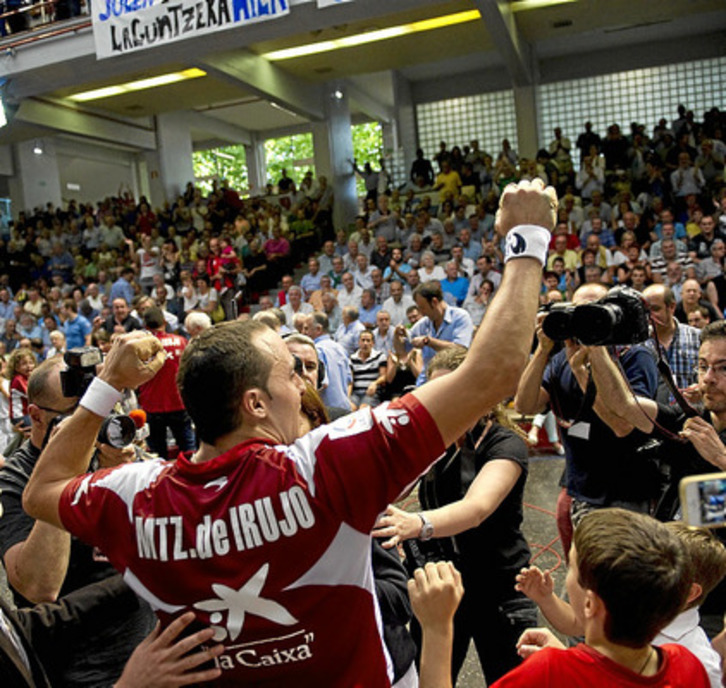 Juan Martínez de Irujo estaba exultante tras el partido. «Ha sido un campeonato muy complicado. Lo he ganado con la derecha, no la final, también el resto de los partidos. Todo esto lo veía muy lejos cuando comenzó, pero ahora estoy con la txapela puesta. Quiero dedicarles a todos los que están conmigo día a día y a todos los que han creído en mí», afirmó el campeón del Manomanista.