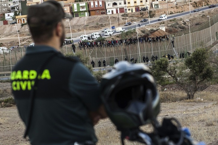 Un guardia civil vigila la frontera de Melilla mientras decenas de migrantes aguardan hasta el agotamiento. (José COLÓN / AFP)