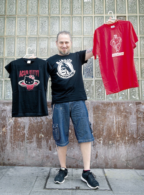 Los clásicos... que no lo son y mucha reivindicación. «La primavera está hasta los cojones del Corte Inglés», «Esto no es una barriga, es una camiseta con relieve», «Salgo más que el camión de la basura», «Vengo con el idiota (una flecha señalando a un lateral)» o «Paga él (otra flecha)» son algunas de las frases que, en una mirada a vuela pluma, se puede encontrar sobre las camisetas que confecciona Koldo Nadal en su tienda Bikoitz del barrio bilbaino de Santutxu. «Estampando camisetas desde 1996» reza su página web y, desde entonces, este hombre, que es pura actividad, no para de maquinar nuevos productos. Hay desde bodys infantiles hasta camisetas que juegan con el Athletic y San Mamés, que para eso es bilbaino. Las hace también por encargo, pero tiene un catálogo importante –«¿De dónde saco las ideas? De frases que dicen los amigos, de noches de juerga...»– y «saca chispas» a la venta online, porque está especializado en el merchandising oficial de grupos heavys internacionales y locales, como Jare, además de que hace también las camisetas de Su ta Gar, aunque la distribuye el propio grupo.
