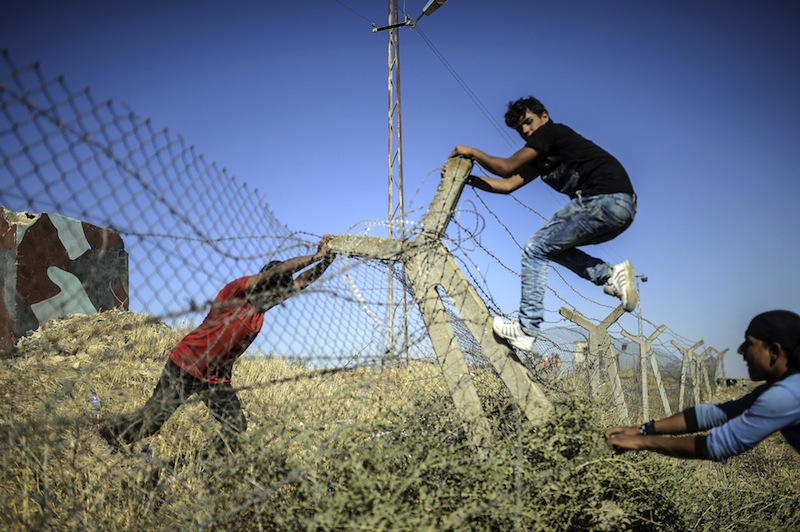Ciudadanos kurdos tratan de derribar la valla fronteriza entre Turquía y Siria.