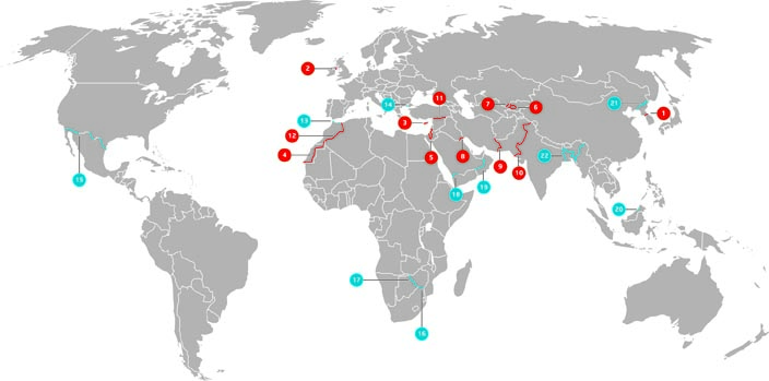 Muros del siglo XXI | Conflictos políticos: 1.- Corea Norte / Corea Sur; 2.- Belfast; 3.- Nicosia; 4.- Marruecos / Sáhara Occidental; 5.- Israel / Gaza y Cisjordania; 6.- Uzbekistán / Kirguizistán; 7.- Kazajistán / Uzbekistán; 8.- Irak / Kuwait; 9.- Irán / Pakistán; 10.- India / Kashmir; 11.- Turquía / Siria; 12.- Marruecos / Argelia. Barreras contra la inmigración: 13.- Ceuta y Melilla / Marruecos; 14.- Grecia / Turquía; 15.- Estados Unidos / México; 16.- Sudáfrica / Zinbawe; 17.- Botswana / Zinbawe; 18.- Arabia Saudí / Yemen; 19.- Arabia Saudí / Emiratos Árabes / Omán; 20.- Brunei / Malasia; 21.- China / Corea del Norte; 22.- India / Bangladesh / Myanmar.
