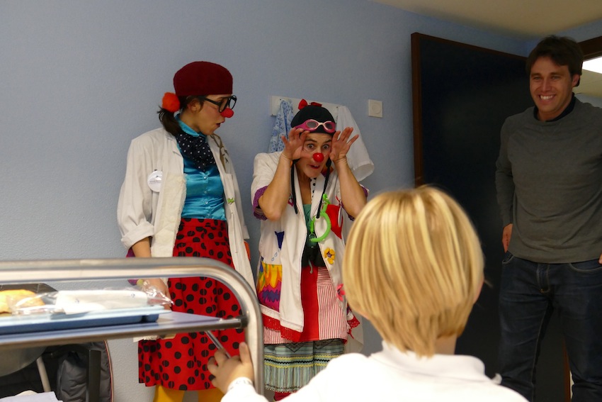 Ha bastado vestirse de payasas y hacer unos peculiares ejercicios de calentamiento para que Saioa y Zaira entren en el papel y partan hacia las habitaciones –hoy son solo dos, pues no pueden acceder a los niños en aislamiento– en medio de bromas y sorpresas a las enfermeras y celadores que cruzan en los pasillos: por ejemplo, el dedo que aprieta el botón del ascensor se ha iluminado en rojo, como una bombilla. Y el prodigio se repite cuando Pantxineta toca al aita de Diego –uno de los niños visitados– a la altura del corazón y lleva el dedo hasta el pecho del chaval, que en realidad parece más confuso que divertido por este «trasplante». La pequeña maleta que portan las payasas se abre en la habitación y deja al descubierto sus tesoros, una variedad de artilugios que en manos de las dos clown se convierten en animales, instrumentos musicales o herramientas mágicas, con las que logran finalmente la atención de Diego y su complicidad.